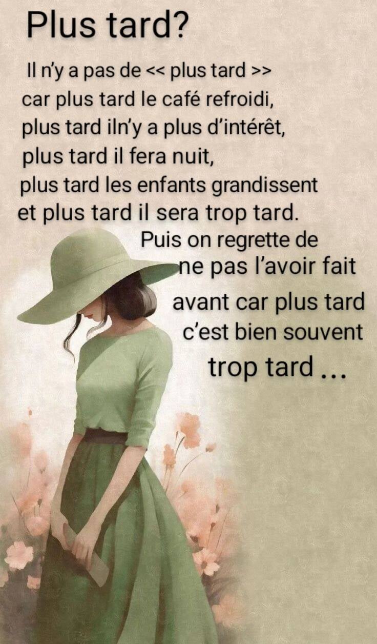 Prendre des risques raisonnés oui, maintenant avec le Seigneur, tu oses le faire. Tu poses un pied devant l’autre avec Lui comme soutien. Il t’accopagne dans toutes les circonstances. Tu comprends maintenant que le drame de ta vie est de stagner, tourner en rond, répéter les mêmes schémas, les mêmes scénarios et de t’en vouloir de ne pas en sortir, de ne pas aller vers autre chose, de ne pas oser...